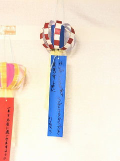 今月の工作は、七夕飾りを作りました。皆にそれぞれお願い事を書いてもらって、飾りを作ってもらいました。折り紙をキッチリ角を合わせて折るという作業が苦手な子が多いです。ハサミは器用に使える子もいれば、使えるけれど線に沿って切るのは苦手な子も。それでも皆さん個性豊かな七夕飾りが出来上がりました。出来上がった工作物を壁に貼りだし、皆の願い事を見て微笑ましかったり、中には頭を抱えてしまうようなものだったりで興味深いです。